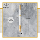 • Het opvallende slanke model vult de iconische maar moderne ontwerpen naadloos aan. Deze Parker-pen is een gedenkwaardig geschenk, vervaardigd met een elegante pearl gelakte behuizing geëtst in een asymmetrisch vierkant motief, geaccentueerd met een gouden afwerking.
