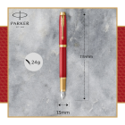 • Deze Parker-pen is een gedenkwaardig geschenk, vervaardigd met een zelfbewuste rood gelakte behuizing geëtst met een subtiel lijnmotief en geaccentueerd met een gouden afwerking.